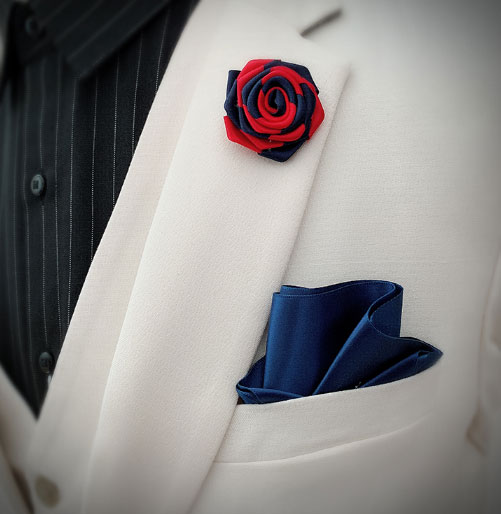 當(dāng)然,小小的口袋巾也可以成為整套西服的點睛之筆,除了在顏色上要選擇與領(lǐng)帶色系一致外,還可以選擇一些有趣的圖案,或者和新娘身上禮服形成呼應(yīng)的顏色!