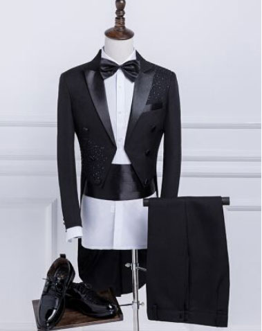燕尾服(晚間大禮服)的特點是:鑲鍛槍駁領,雙排扣,前端是折角短下擺,也就是前短后長帶個尾巴,總衣長近膝。必須配側鑲嵌雙條鍛帶的長褲,馬甲,白色領結。