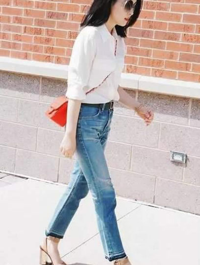 2.純色襯衫和牛仔褲搭配。當(dāng)溫柔淑女氣質(zhì)的純色襯衫遇上休閑青春的牛仔褲時(shí),兩者之間摩擦出來的是既休閑氣質(zhì)又很時(shí)尚的時(shí)髦穿搭。純色襯衫和牛仔褲搭配,在配上運(yùn)動(dòng)鞋或小白鞋,即可以瞬間將人帶入青春的記憶,具有青春的活力。這種搭配非常適合學(xué)生聚會(huì),去玩和約會(huì)。