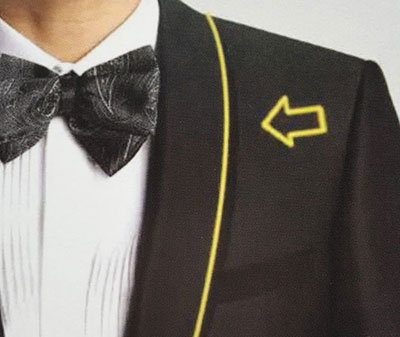不同款式雖有不同扣法,坐姿時可解開,站立時,要在注意將紐扣扣上,以示禮貌。選擇不同的扣數和排數,可看出不同的比例和身材厚實度的變化。